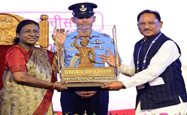 रायपुर। जनजातीय गौरव दिवस के अवसर पर अंबिकापुर में आयोजित कार्यक्रम में एक प्रेरक एवं गरिमामय क्षण देखने को मिला, जब मुख्यमंत्री श्री विष्णुदेव साय ने राष्ट्रपति श्रीमती द्रौपदी मुर्मु को बस्तर आर्ट में निर्मित धरती आबा भगवान बिरसा मुंडा की प्रतिमा स्मृति-चिह्न के रूप में भेंट की। यह प्रतिमा जनजातीय विरासत, शौर्य और छत्तीसगढ़ की सांस्कृतिक अस्मिता का प्रतीक मानी जाती है।